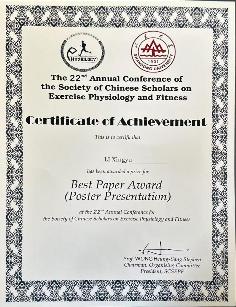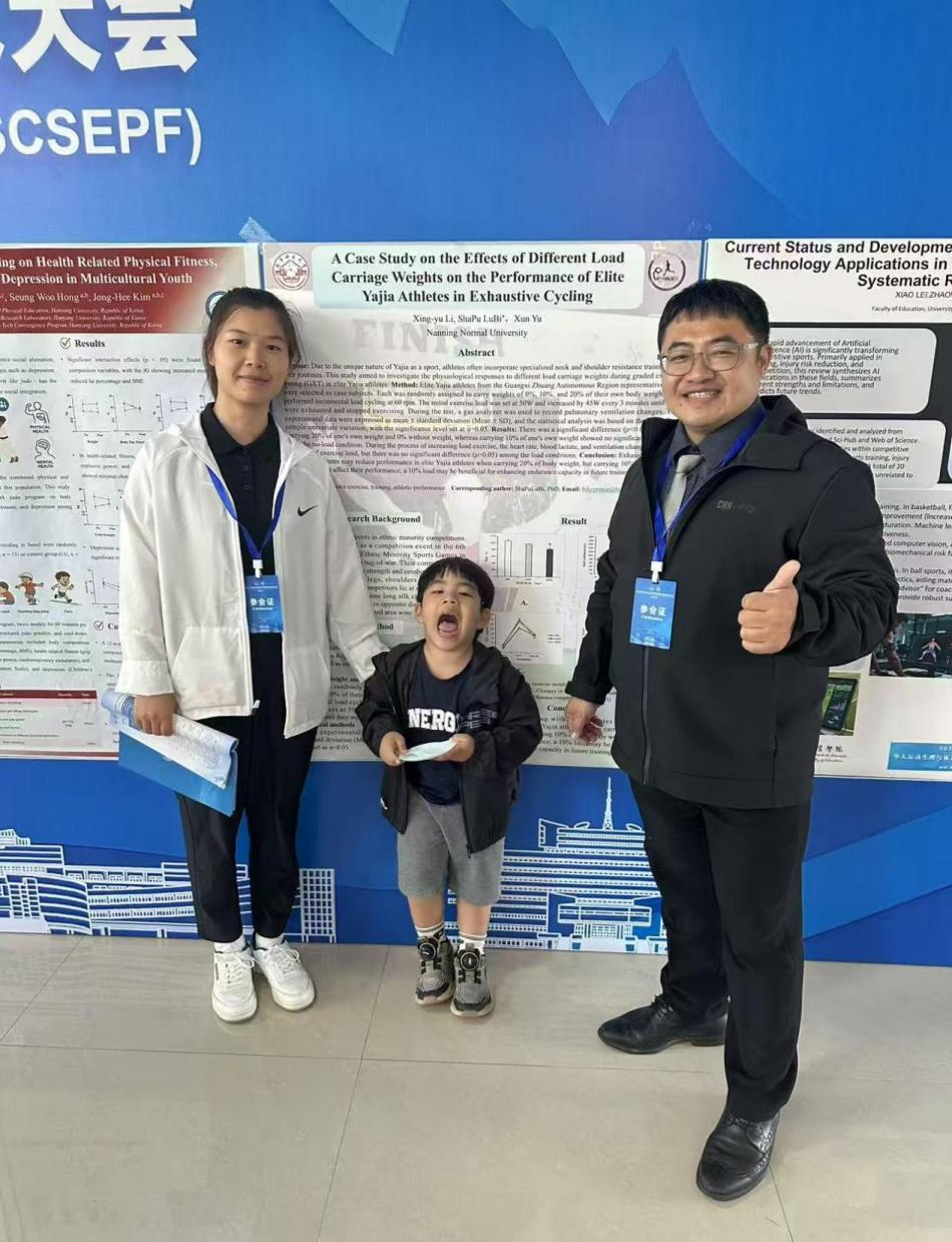 在此次国际学术交流平台上,167net必赢入口师生表现亮眼。2024级体育硕士研究生李兴雨在沙部·鲁比博士的指导下,完成《A Case Study on the Effects of Different Load Carriage Weights on the Performance of Elite Yajia Athletes in Exhaustive Cycling》论文并入围墙报交流环节。其研究以少数民族押加运动为研究对象,立足实践、数据扎实、表达清晰,体现出良好的科研素养与创新能力。指导教师沙部·鲁比博士撰写的《The effect of negative ion pretreatment on the elimination of lipid peroxides after a single bout of endurance exercise》成功入围大会墙报交流,经大会评审,两篇论文均获“优秀论文奖”,体现了167net必赢入口硕士人才培养的质量与成效。