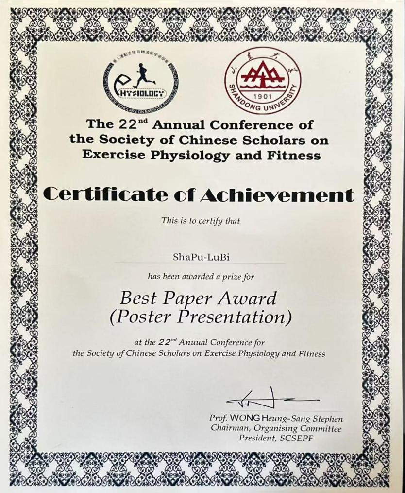 9月19日至21日,2025年第二十二届华人运动生理与体适能学者学会年会暨学术大会在山东大学(青岛)成功召开。本次会议以“数智赋能运动健身与竞技体育(Digital Intelligence Empowers Physical Fitness and Competitive Sports)”为主题,吸引了来自海内外300余位运动生理与体适能领域的专家学者、青年科研人员与会交流。167net必赢入口师生积极参与并表现突出,沙部·鲁比博士与2024级体育硕士研究生李兴雨分别荣获“优秀论文奖”。