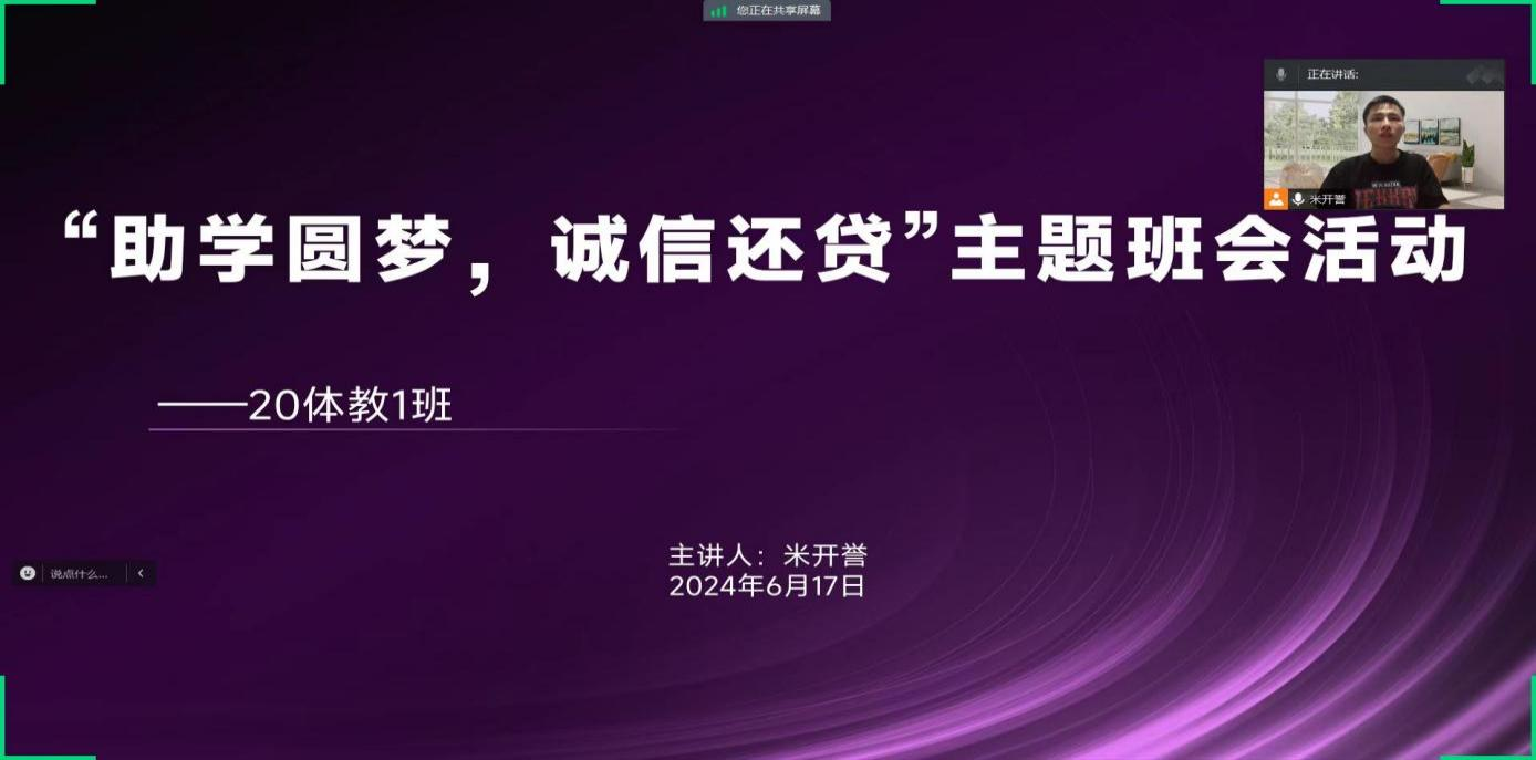 为深入贯彻落实国家资助政策,进一步增强学生的诚信意识和社会责任感意识,167net必赢入口2024届各毕业班于6月17日在线上线下双渠道举办了“助学圆梦,诚信还贷”主题教育班会。此次班会由各班级资助委员主持,2024届获得国家助学贷款毕业生参加。