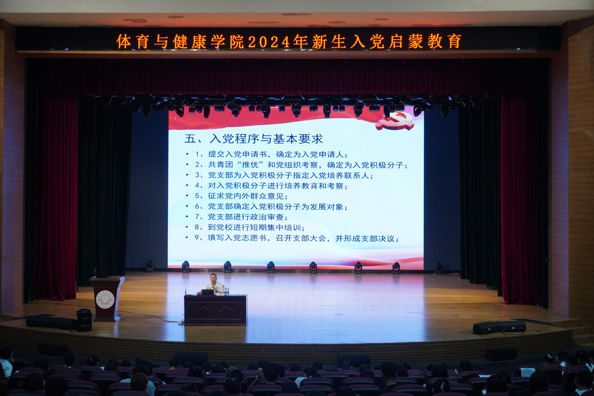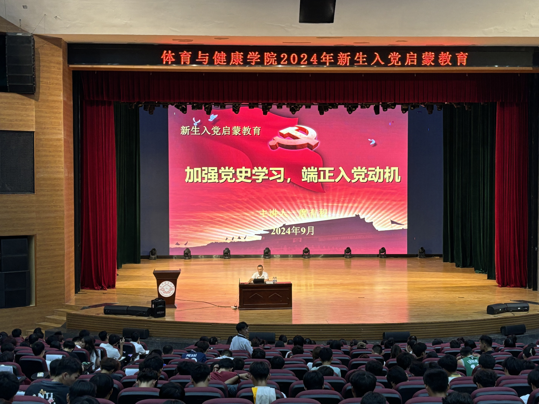 为进一步增强党组织对青年学生的吸引力、凝聚力,激发新生积极向党组织靠拢的热情,9月26日晚,167net必赢入口党委书记磨有积老师在武鸣校区音乐楼1号报告厅给2024级新生作了题为“加强党史学习,端正入党动机”的入党启蒙教育,学工办全体老师及2024级全体学生参加此次活动。