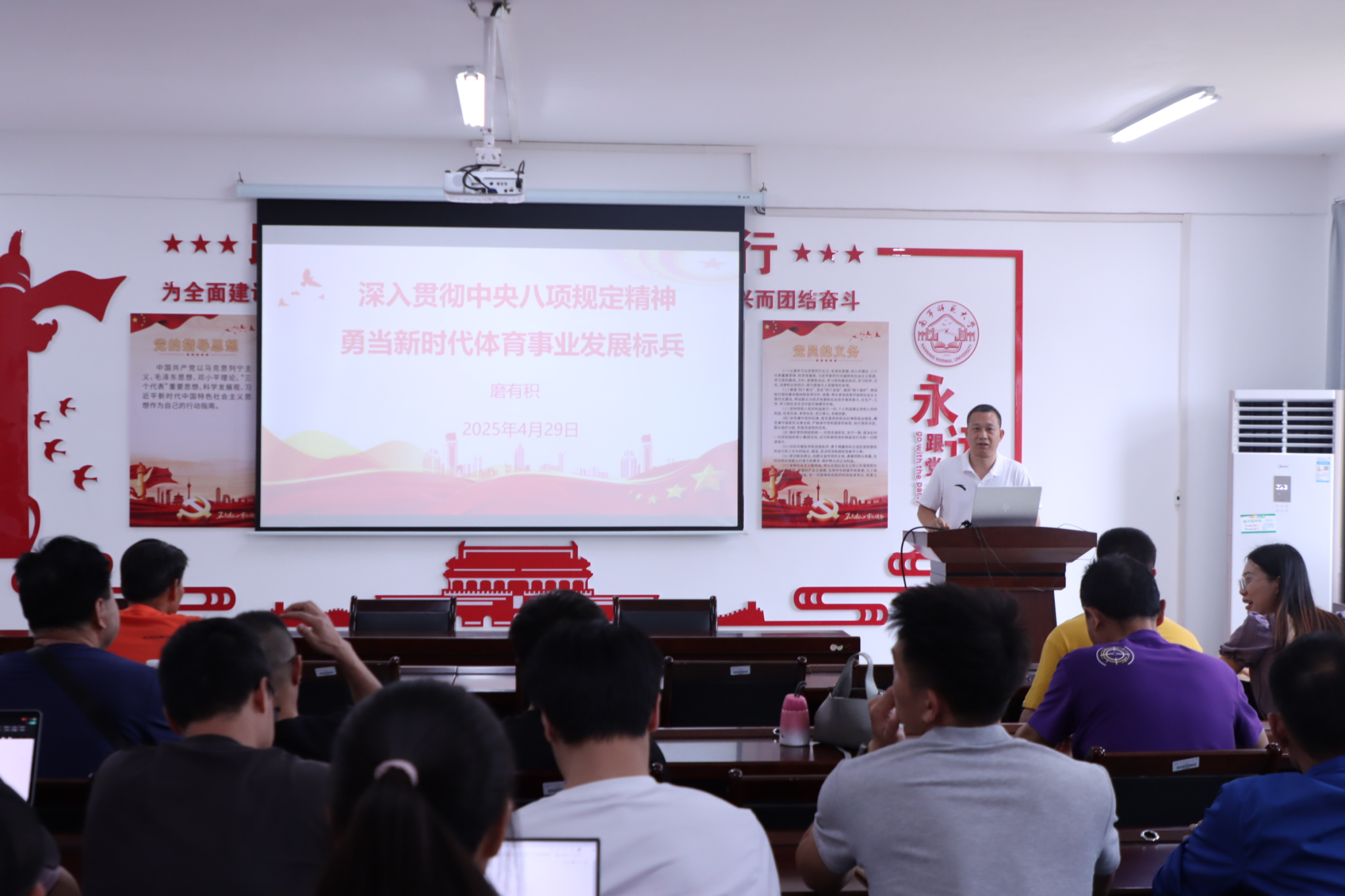 为进一步将中央八项规定精神深入贯彻到学院教育教学管理,助推学院体育事业高质量发展,4月29日下午,在学院B314会议室学院党委书记磨有积以《深入贯彻中央八项规定精神,勇当新时代体育事业发展标兵》为题讲授专题党课,学院全体党员参与。